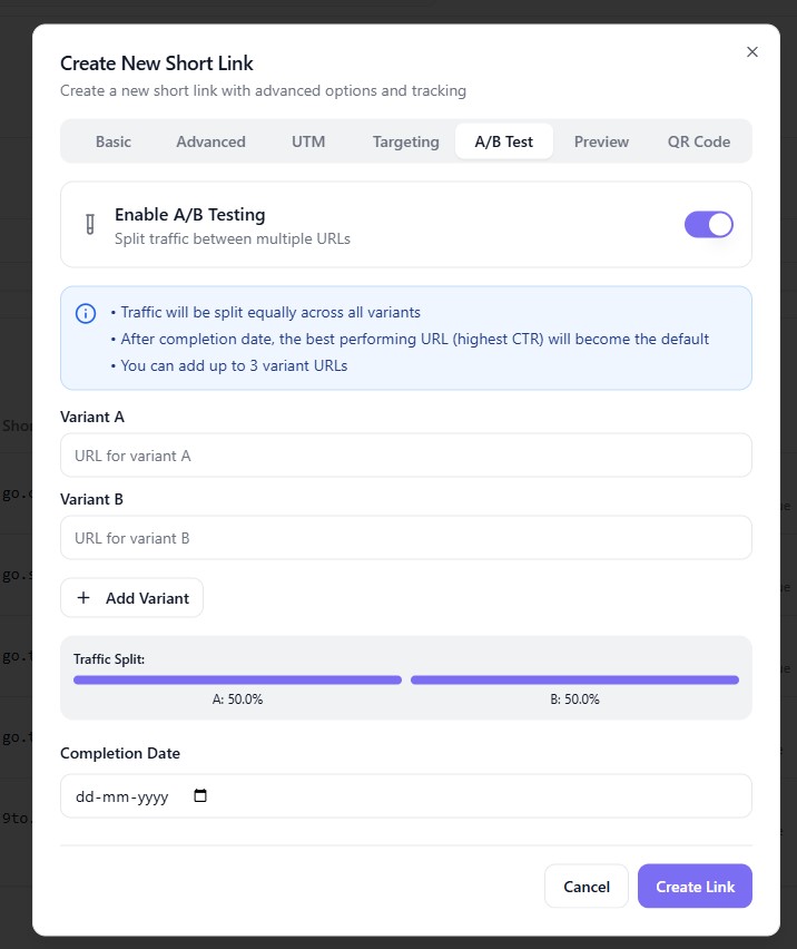 A/B testing (also known as split testing) helps you compare multiple versions of a URL to see which performs better. With 9to.in, you can easily split traffic between different links and automatically identify the best-performing one.