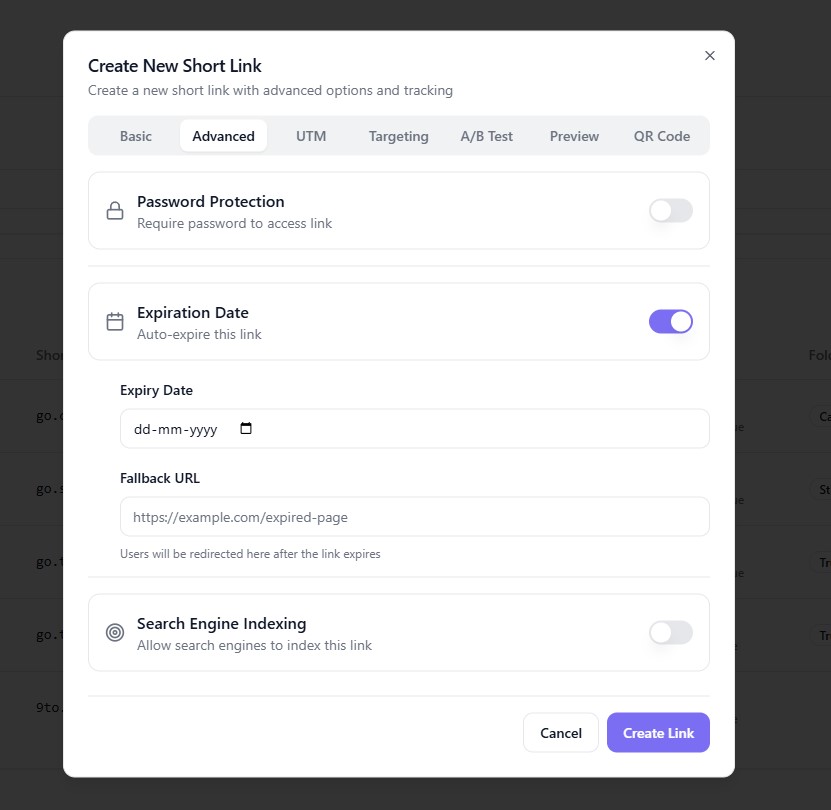 Managing how long your links stay active is important for time-sensitive campaigns. With 9to.in, you can set expiration dates for links and define fallback URLs to redirect users after the link expires.