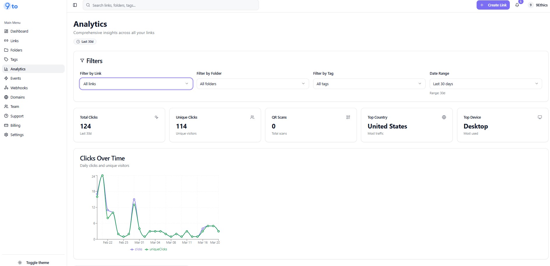 The 9to analytics dashboard gives you everything you need to track, analyze, and optimize your links. With real-time insights and detailed breakdowns, you can make smarter marketing decisions and maximize your results.